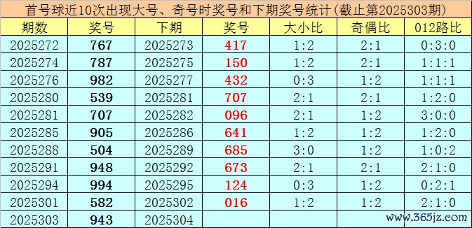 在首号球前10次开出大号、奇号类型之后,其下期永别开出奖号:417、150、432、707、096、641、685、673、124、016,其中号码大小比为4:6,012路比为5:5:0,奇偶比为3:7。