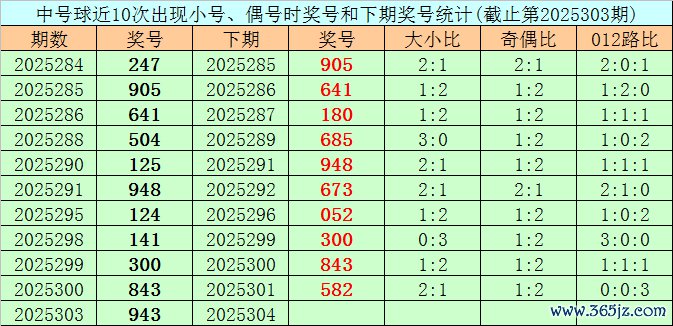 中号球:上期奖号为4,开出小 号、偶号,该位前10次开出小 号、偶号的气候时其奖号永别为:247、905、641、504、125、948、124、141、300、843,其中中号球012路比为3:5:2。