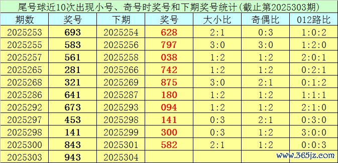 尾号球:上期奖号为3,开出小 号、奇号,该位前10次开出小 号、奇号的气候时其奖号永别为:693、583、561、281、321、641、673、453、141、843,其中尾号球012路比为5:5:0。
