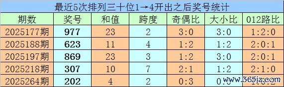 1、最近两期罗列三十位号码开出号码区别为1和4,历史上十位号码聚合两期同期出现号码1和4的奖号共开出81期。最近五次下期开出号码为:977、623、869、307、202;