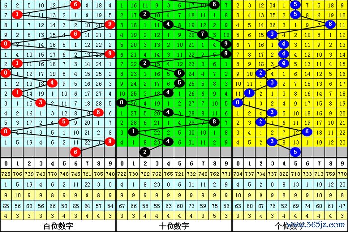 3、在以上0-9号码频次中,号码012路比为28:18:16,奇偶比为34:28,本期预测百位开出偶数号码,参考号码6。